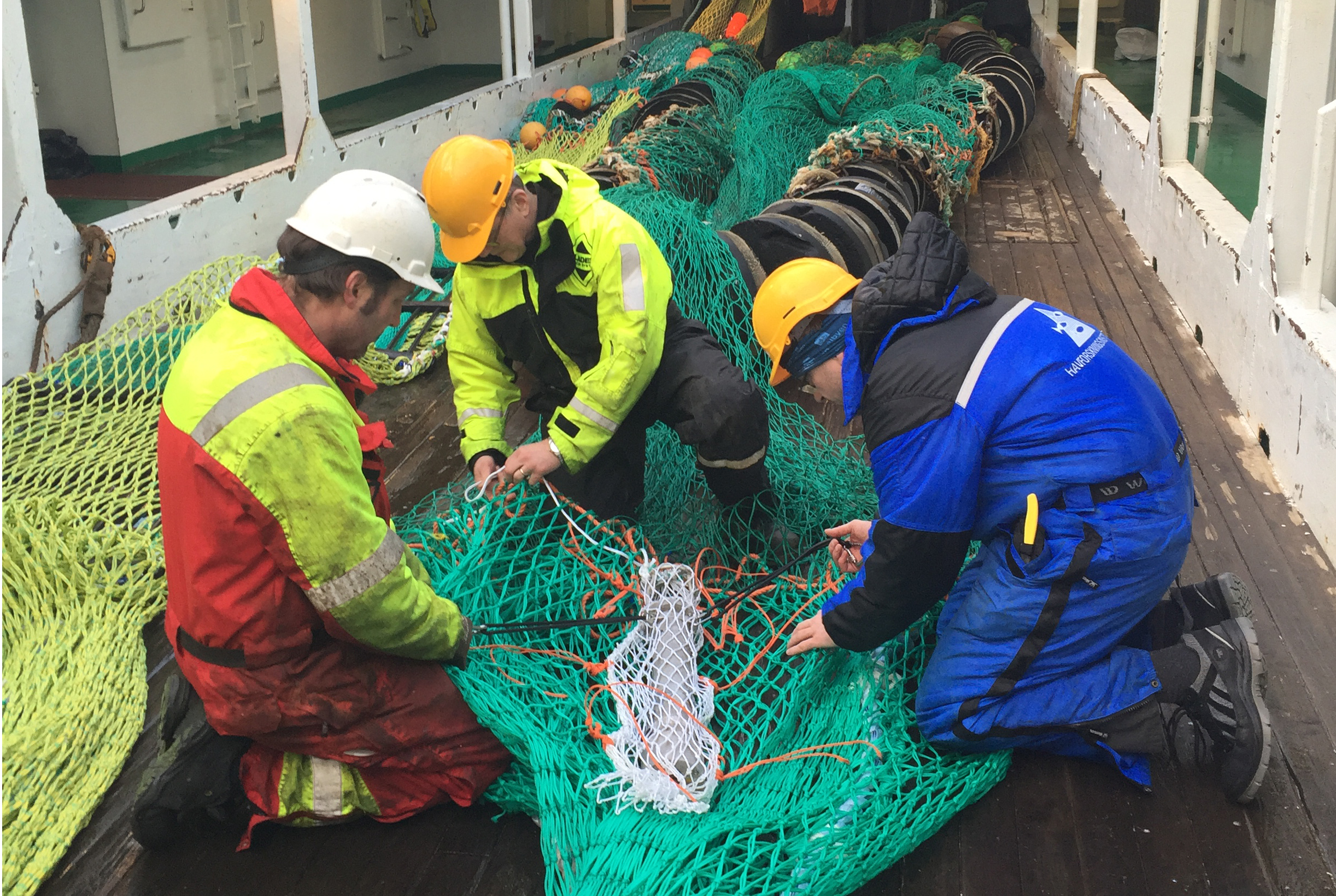 Utprøving av høgfrekvent ADCP inne i trålen for å kartleggja finskala straumar og turbulensfelt inne i trålen (HI/Nortek/Simrad, Melanie Underwood, Egil Ona, Thor Bærhaugen)